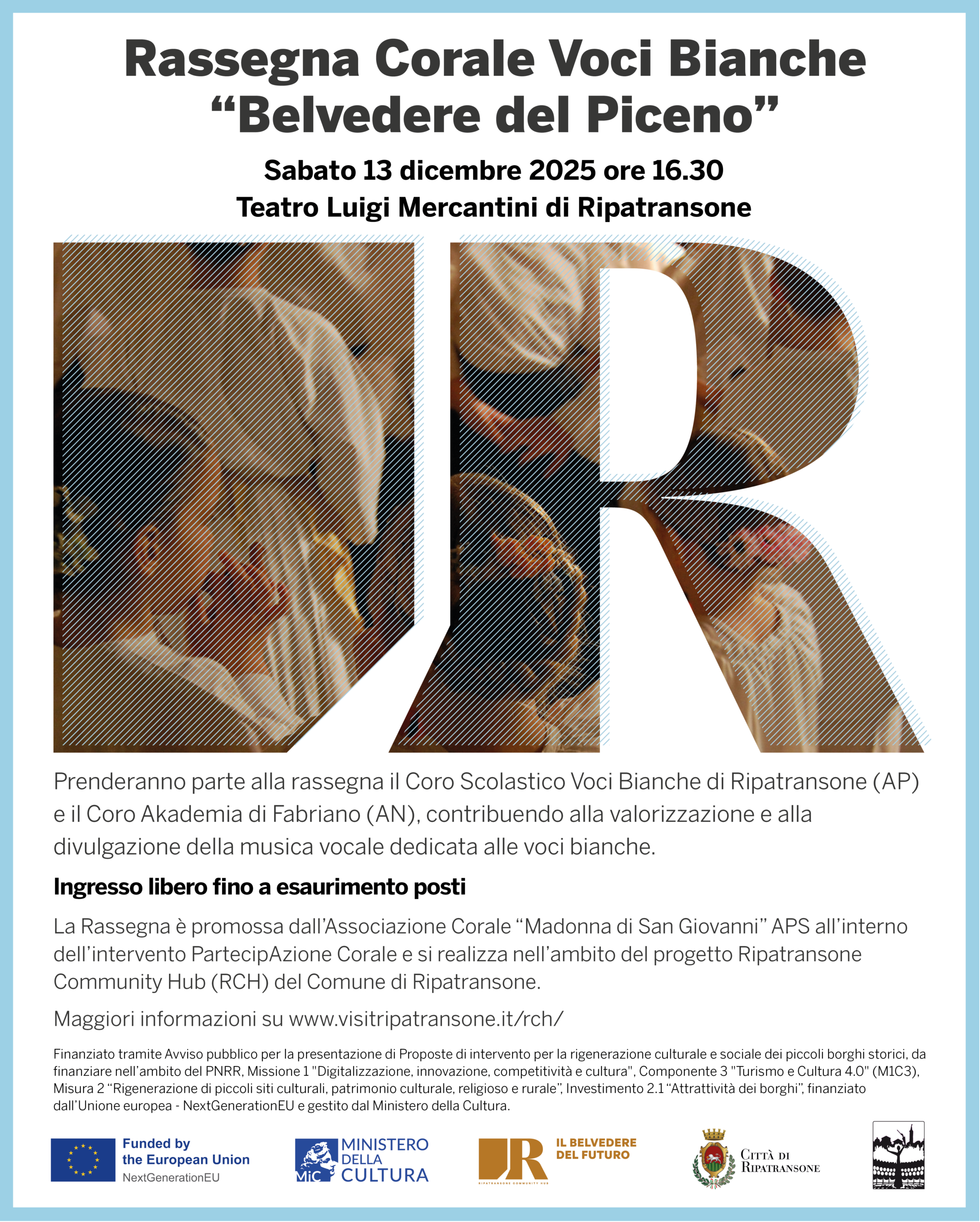 L’Associazione Corale Madonna di San Giovanni APS presenta la Rassegna Corale Voci Bianche “Belvedere del Piceno”, realizzata all’interno dell’intervento Partecip-Azione Corale e nell’ambito del progetto Ripatransone Community Hub (RCH) del Comune di Ripatransone. L’iniziativa è dedicata alla valorizzazione del canto corale giovanile e offre al pubblico un’occasione unica per scoprire il talento dei giovani cantori del territorio.