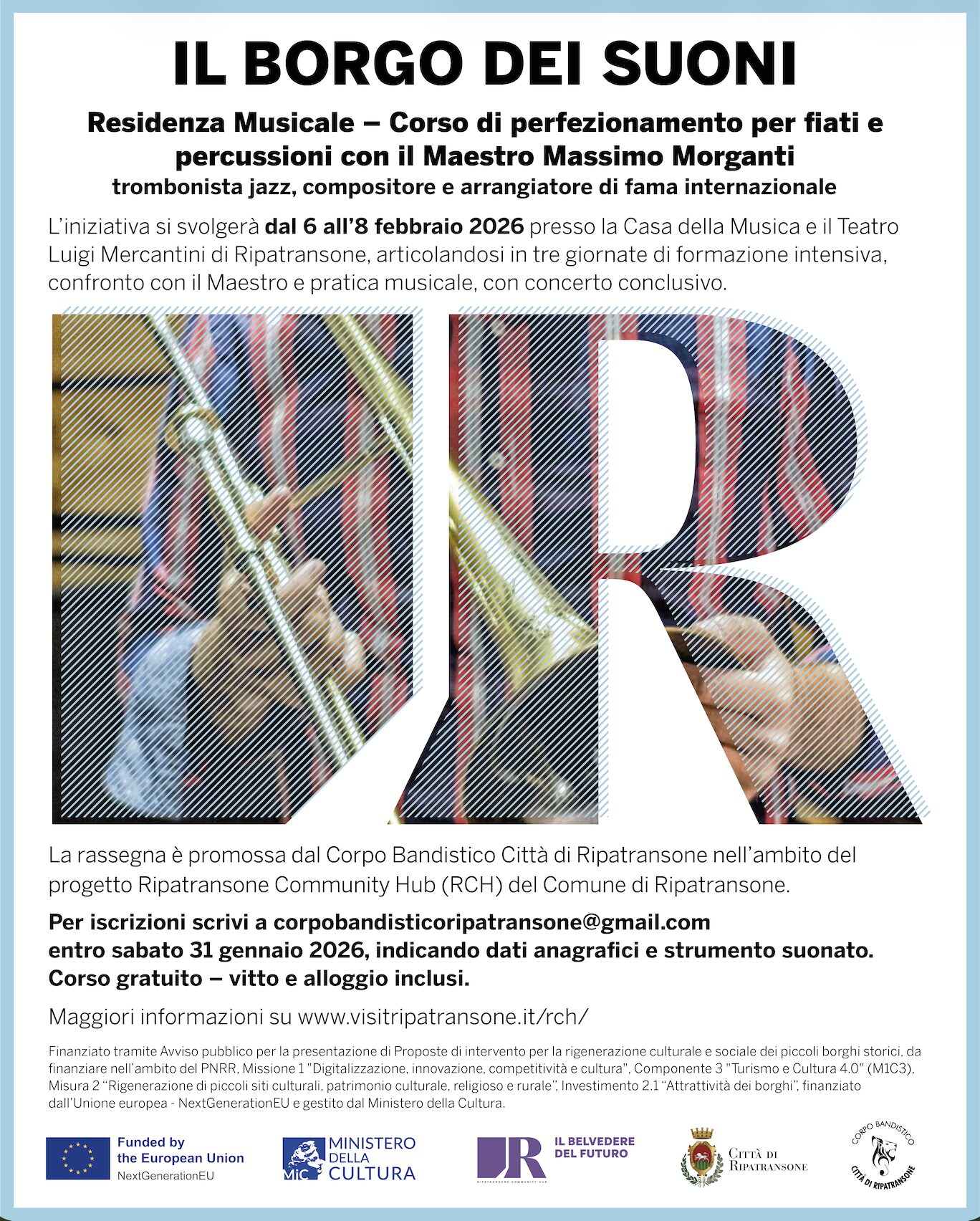 L’iniziativa è promossa dal Corpo Bandistico Città di Ripatransone e si inserisce nel progetto Ripatransone Community Hub (RCH) del Comune di Ripatransone, finalizzato alla valorizzazione del patrimonio culturale locale attraverso pratiche formative, artistiche e comunitarie capaci di rafforzare il legame tra cultura, territorio e comunità.