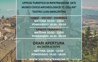 Orari di apertura dal 25 Aprile al 30 Maggio 2024 ▪️𝐈𝐀𝐓 (𝐔𝐟𝐟𝐢𝐜𝐢𝐨 𝐈𝐧𝐟𝐨𝐫𝐦𝐚𝐳𝐢𝐨𝐧𝐢 𝐓𝐮𝐫𝐢𝐬𝐭𝐢𝐜𝐡𝐞) ▪️𝐌𝐮𝐬𝐞𝐨 𝐂𝐢𝐯𝐢𝐜𝐨 𝐀𝐫𝐜𝐡𝐞𝐨𝐥𝐨𝐠𝐢𝐜𝐨 𝐂.𝐂𝐞𝐥𝐥𝐢𝐧𝐢 ▪️𝐓𝐞𝐚𝐭𝐫𝐨 𝐋𝐮𝐢𝐠𝐢 𝐌𝐞𝐫𝐜𝐚𝐧𝐭𝐢𝐧𝐢 Ogni