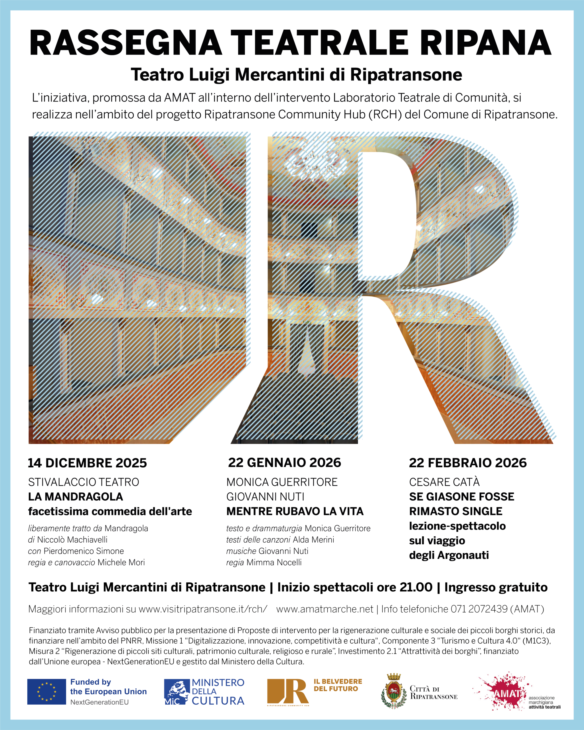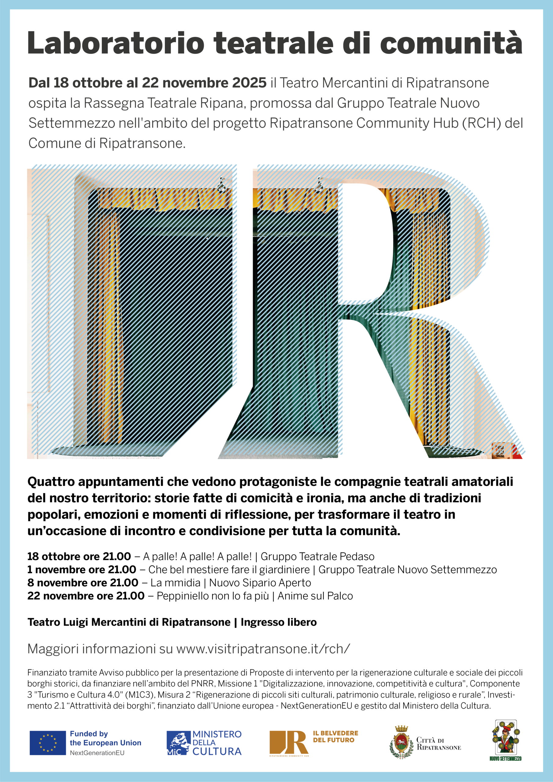 Non è per caso, dunque, che il gruppo teatrale Nuovo Settemmezzo abbia deciso di mettere in gioco la sua esperienza di oltre trent’anni nel campo teatrale per proporre, nell’ambito del progetto, una rassegna di teatro amatoriale, una di teatro contemporaneo e un corso di teatro giovanile rivolto alle ragazze e ai ragazzi della scuola secondaria di primo grado, che darà vita a una produzione teatrale originale. Saranno poi realizzate attività di valorizzazione del Dialetto Ripano attraverso una ricerca, una pubblicazione e una raccolta di ricette tipiche in dialetto, collezionate con il coinvolgimento delle persone del borgo e dei ristoratori locali attraverso un processo partecipativo.
