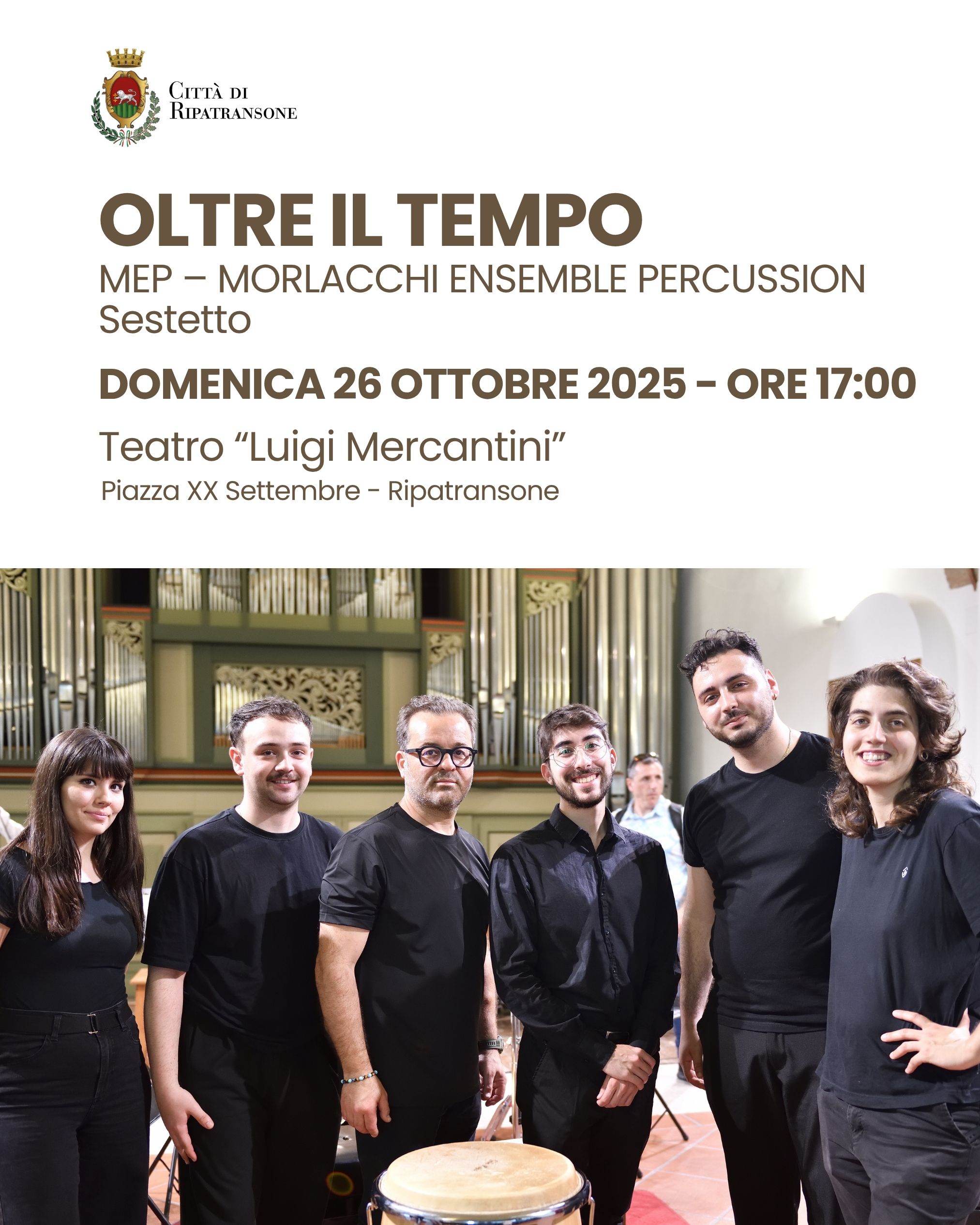 Ripatransone, nell’ambito della rassegna “Concerti Oro – MALIBRAN CLASSICA”, ospiterà domenica 26 ottobre alle ore 10:00 presso il Teatro Luigi Mercantini, l’evento “OLTRE IL TEMPO” con il MEP – MORLACCHI ENSEMBLE PERCUSSION Sestetto, diretto da GIANLUCA SAVERI.