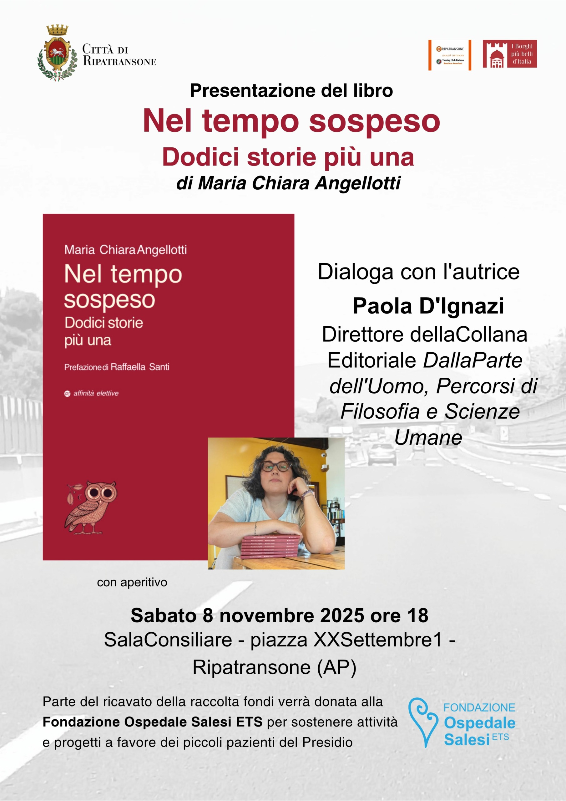 A Ripatransone, sabato 8 novembre, presentazione del libro “Nel tempo sospeso – Dodici storie più una” di Maria Chiara Angellotti, edito da Affinità Elettive.