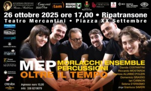 Ripatransone, nell’ambito della rassegna “Concerti Oro – MALIBRAN CLASSICA”, ospiterà domenica 26 ottobre alle ore 10:00 presso il Teatro Luigi Mercantini, l’evento “OLTRE IL TEMPO” con il MEP – MORLACCHI ENSEMBLE PERCUSSION Sestetto, diretto da GIANLUCA SAVERI.